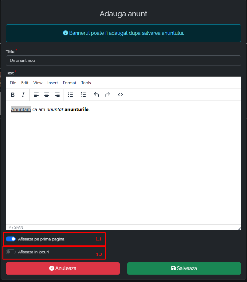 In aceasta pagina se pot adauga si modifica anunturile prezente atat pe pagina principala a aplicatiei clientilor cat si in jocuri.