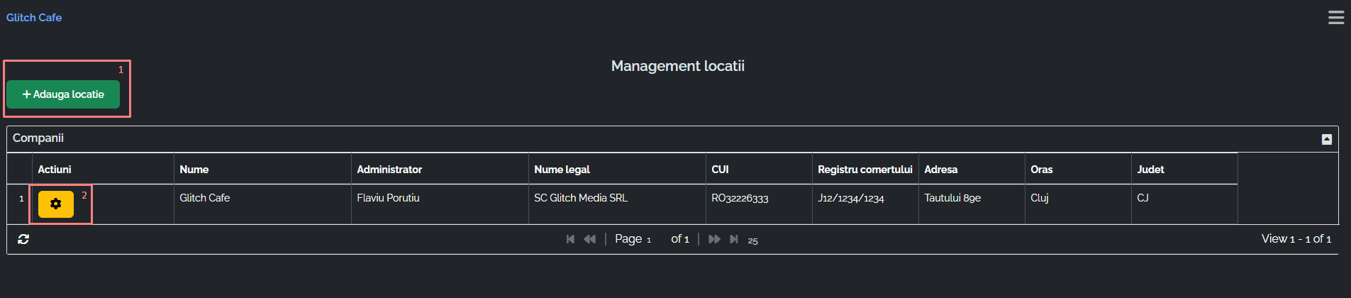 • Adauga locatie (marcat cu 1) – se completeaza datele cerute. La creerea fiecarei locatii, este necesar sa fie o persoana setata ca si administrator. Aceasta persoana poate fi tot superadmin-ul sau o alta persoana din staff cu un cont activ. (click aici pentru a documentatia pentru crearea conturilor pentru staff).